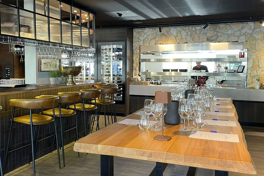 La Teca si presenta sobria ed elegante, volutamente minimalista ed essenziale. L’ampia superficie vetrata mette in risalto l’originale esposizione orizzontale delle bottiglie, creando una suggestiva scenografia.